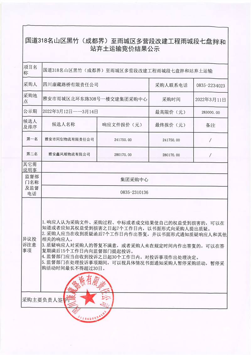 四川康藏路橋有限責任公司國道318名山區(qū)黑竹(成都界)至雨城區(qū)多營段改建工程雨城段七盤拌和站棄土運輸競價結果公示