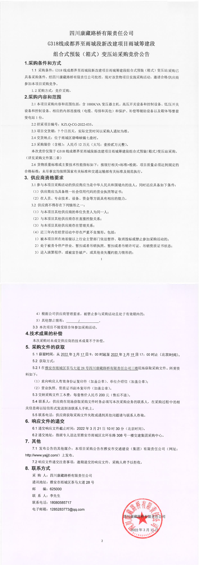 四川康藏路橋有限責(zé)任公司G318線(xiàn)成都界至雨城段新改建項(xiàng)目雨城籌建段組合式預(yù)裝(箱式)變壓站采購(gòu)競(jìng)價(jià)公告