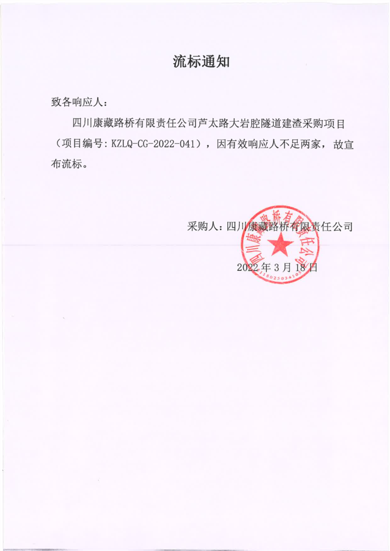四川康藏路橋有限責(zé)任公司蘆太路大巖腔隧道建渣采購(gòu)項(xiàng)目流標(biāo)通知
