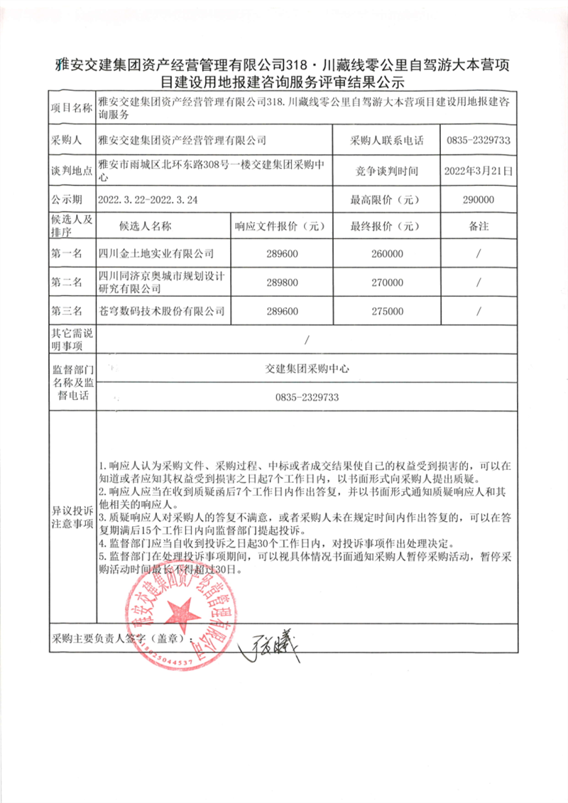 雅安交建集團資產(chǎn)經(jīng)營管理有限公司318川藏線零公里自駕游大本營項目建設(shè)用地報建咨詢服務(wù)評審結(jié)果公示