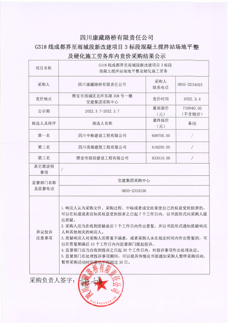 四川康藏路橋有限責(zé)任公司G318線成都界至雨城段新改建項(xiàng)目3標(biāo)段混凝土攪拌站場(chǎng)地平整及硬化施工勞務(wù)庫(kù)內(nèi)競(jìng)價(jià)采購(gòu)結(jié)果公示