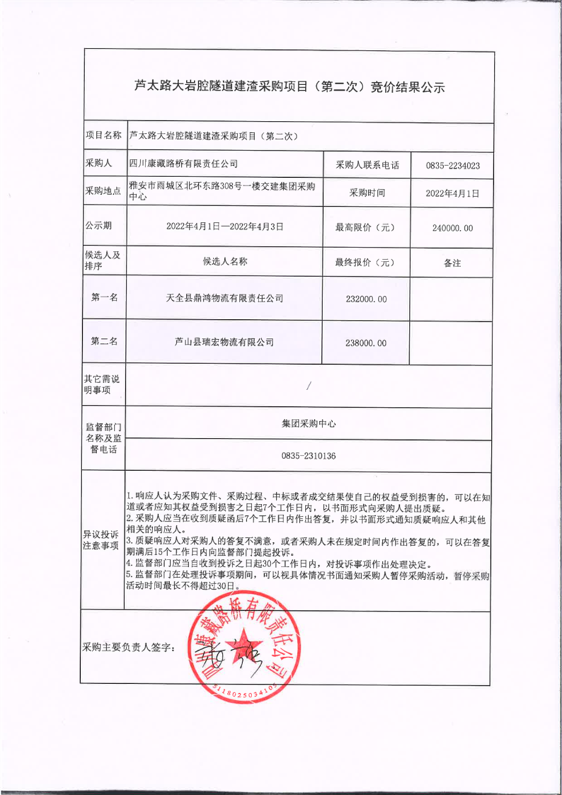 四川康藏路橋有限責(zé)任公司蘆太路大巖腔隧道建渣采購項(xiàng)目(第二次)競(jìng)價(jià)結(jié)果公示