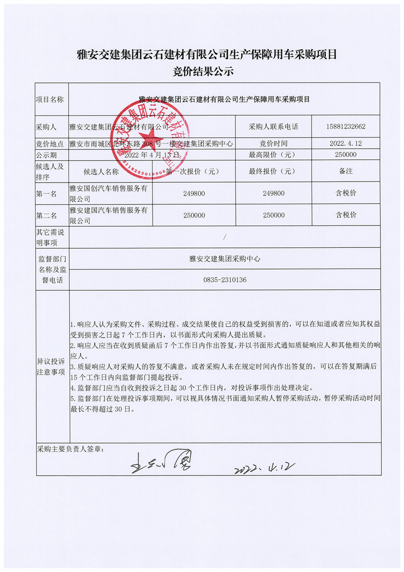 雅安交建集團云石建材有限公司生產保障用車采購項目競價結果公示