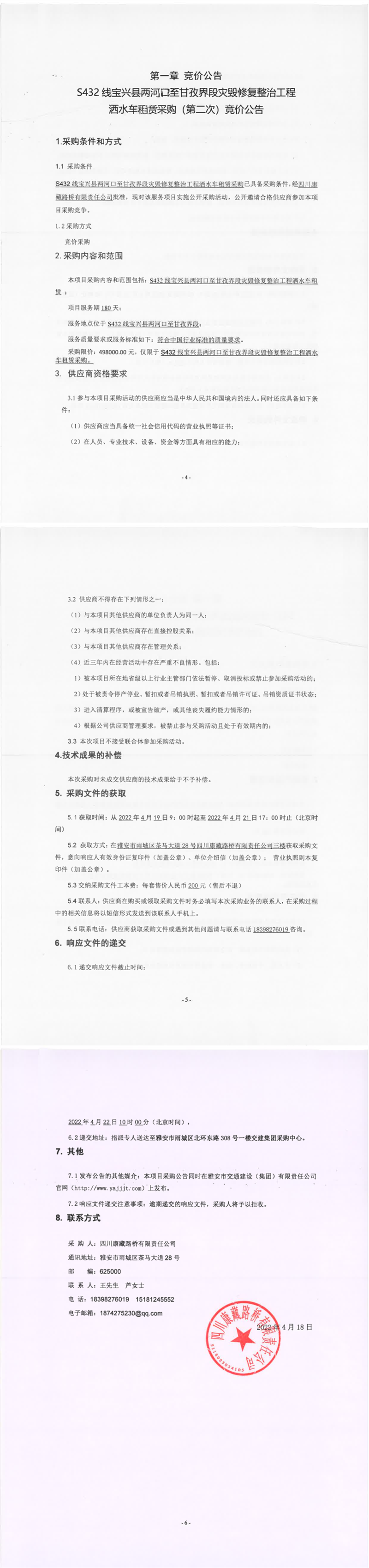 四川康藏路橋有限責任公司S432線寶興縣兩河口至甘孜界段災毀修復整治工程灑水車租賃采購(第二次)競價公告