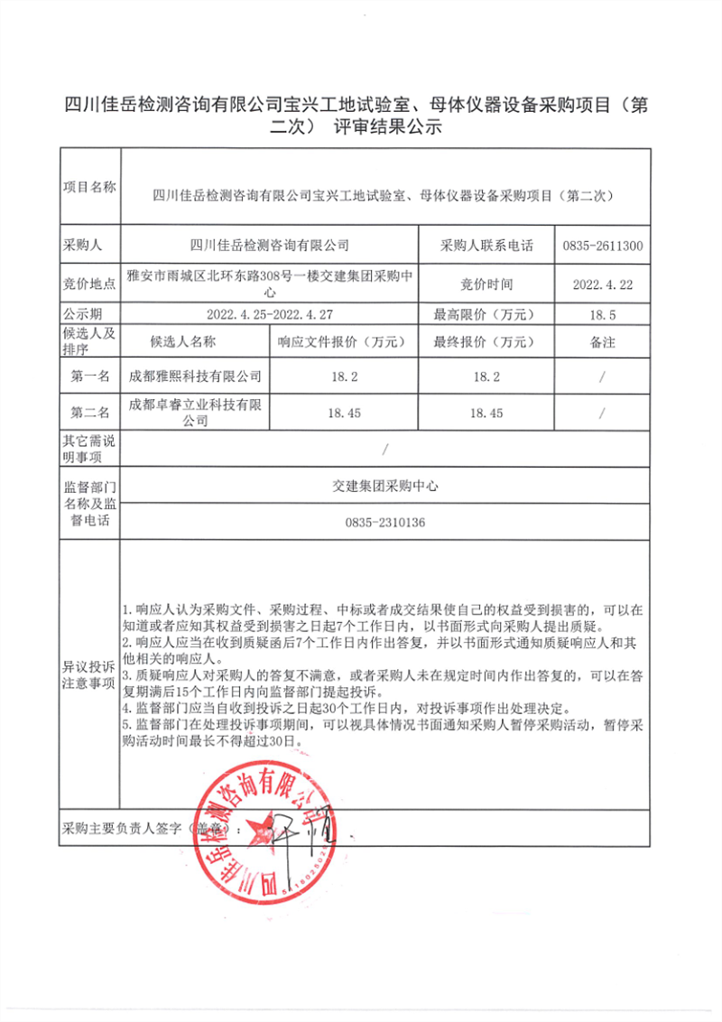 四川佳岳檢測(cè)咨詢有限公司寶興工地試驗(yàn)室、母體儀器設(shè)備采購項(xiàng)目(第二次)評(píng)審結(jié)果公示