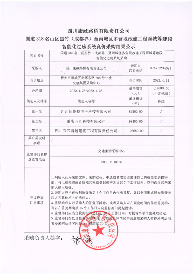 四川康藏路橋有限責任公司國道318名山區(qū)黑竹(成都界)至雨城區(qū)多營段改建工程雨城籌建段智能化過磅系統(tǒng)競價采購結(jié)果公示