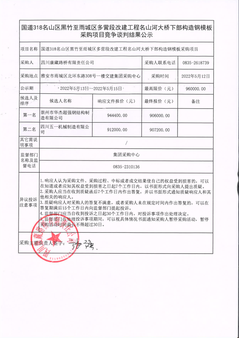 四川康藏路橋有限責(zé)任公司國(guó)道318名山區(qū)黑竹至雨城區(qū)多營(yíng)段改建工程名山河大橋下部構(gòu)造鋼模板采購(gòu)項(xiàng)目競(jìng)爭(zhēng)談判結(jié)果公示