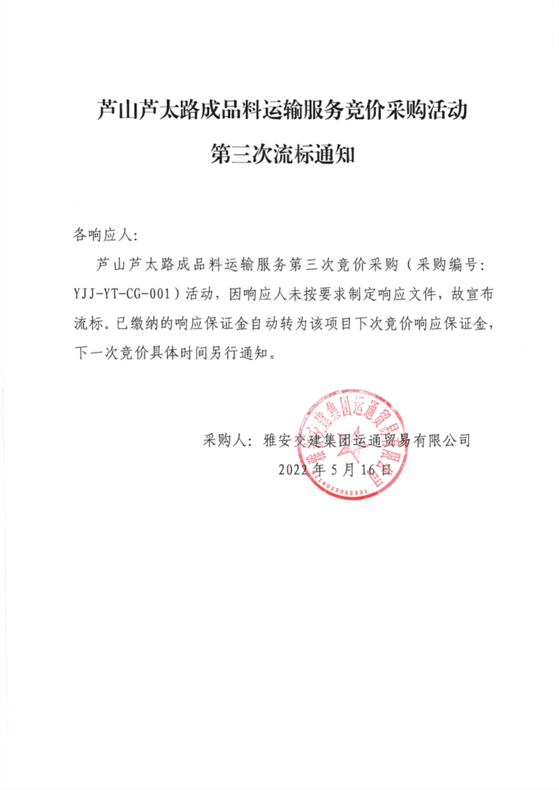 雅安交建集團運通貿易有限公司蘆山蘆太路成品料運輸服務競價采購活動第三次流標通知