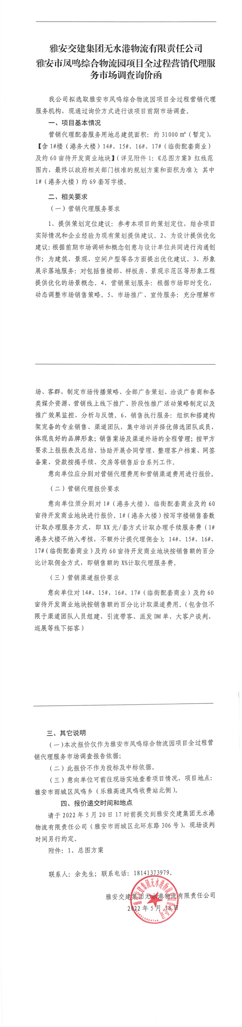 雅安交建集團無水港物流有限責(zé)任公司雅安市鳳鳴綜合物流園項目全過程營銷代理服務(wù)市場調(diào)查詢價函