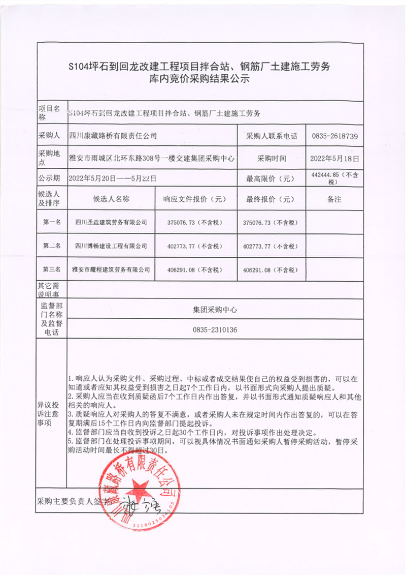 四川康藏路橋有限責任公司S104坪石到回龍改建工程項目拌合站、鋼筋廠土建施工勞務庫內(nèi)競價采購結果公示