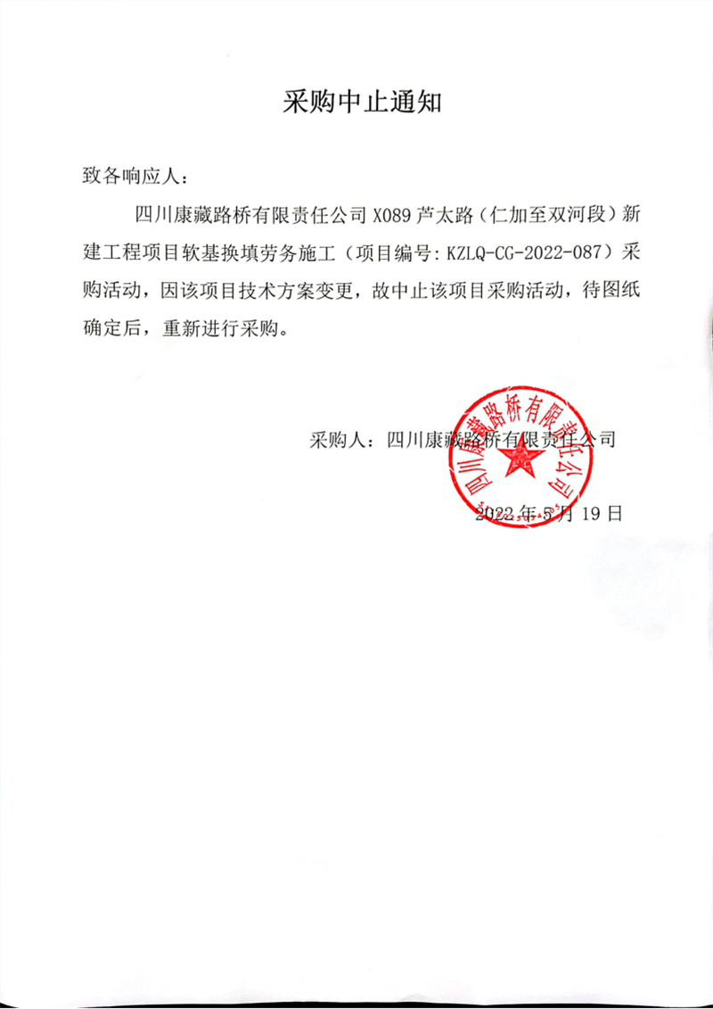 四川康藏路橋有限責(zé)任公司X089蘆太路(仁加至雙河段)新建工程項(xiàng)目軟基換填勞務(wù)施工采購中止通知