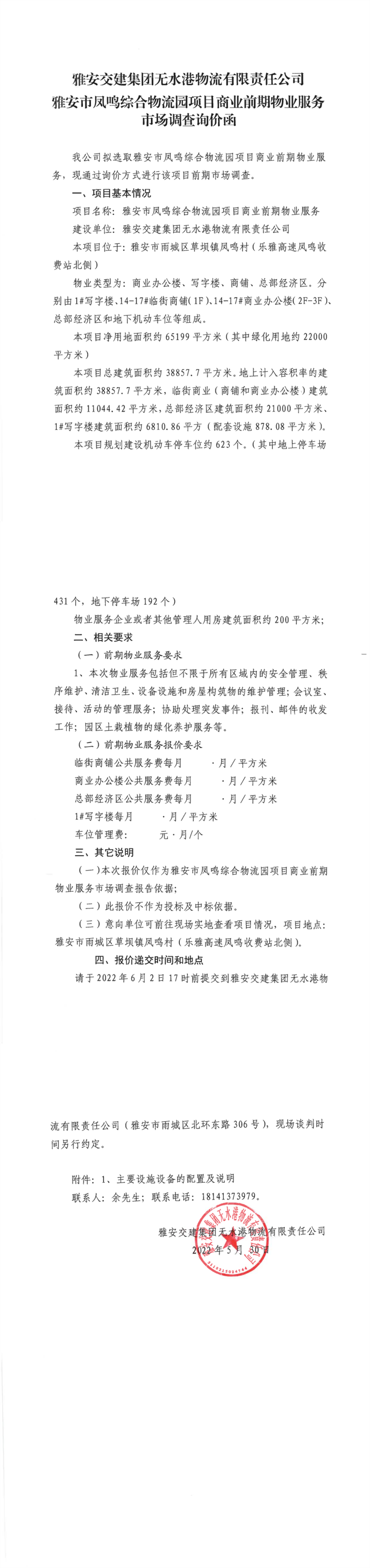 雅安交建集團(tuán)無水港物流有限責(zé)任公司雅安市鳳鳴綜合物流園項目商業(yè)前期物業(yè)服務(wù)市場調(diào)查詢價函
