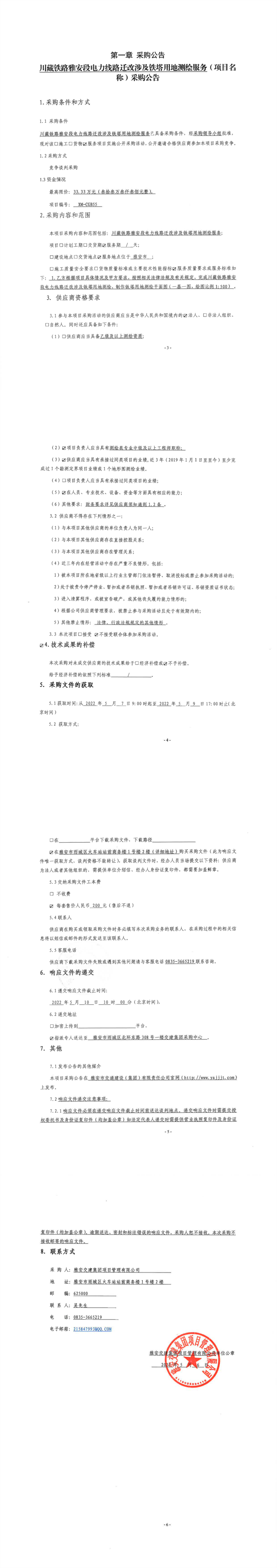 雅安交建集團(tuán)項(xiàng)目管理有限公司川藏鐵路雅安段電力線路遷改涉及鐵塔用地測(cè)繪服務(wù)采購(gòu)公告