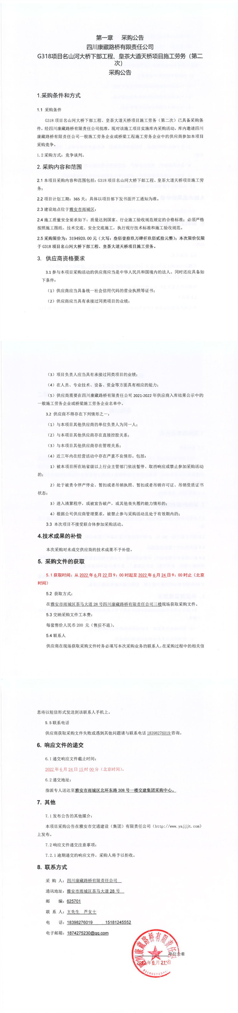 四川康藏路橋有限責(zé)任公司G318項目名山河大橋下部工程、皇茶大道天橋項目施工勞務(wù)(第二次)采購公告