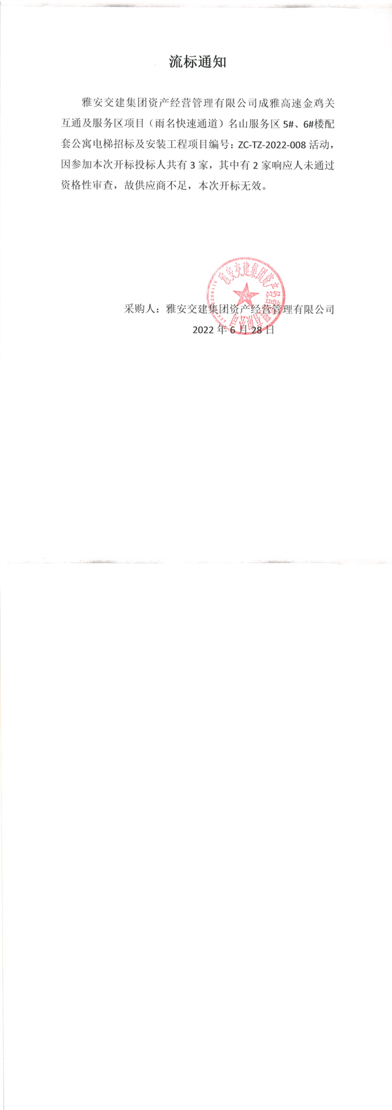 雅安交建集團(tuán)資產(chǎn)經(jīng)營管理有限公司成雅高速金雞關(guān)互通及服務(wù)區(qū)(雨名快速通道)名山服務(wù)區(qū)5#、6#樓配套公寓電梯招標(biāo)及安裝工程項目流標(biāo)通知