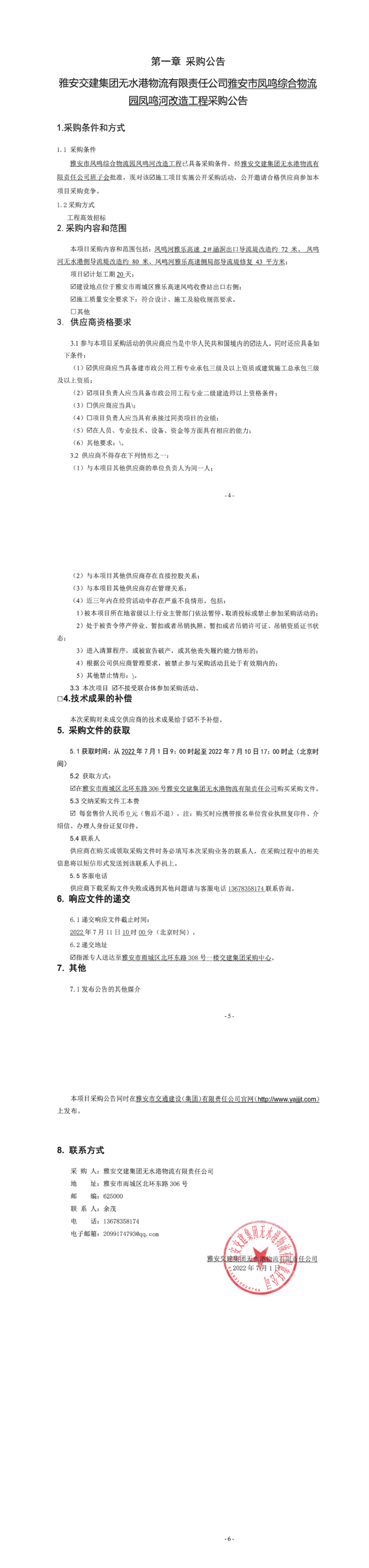 雅安交建集團(tuán)無水港物流有限責(zé)任公司雅安市鳳鳴綜合物流園鳳鳴河改造工程采購公告