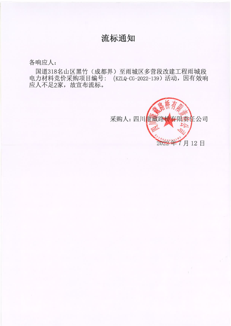 四川康藏路橋有限責任公司國道318名山區(qū)黑竹(成都界)至雨城區(qū)多營段改建工程雨城段電力材料競價采購項目流標通知