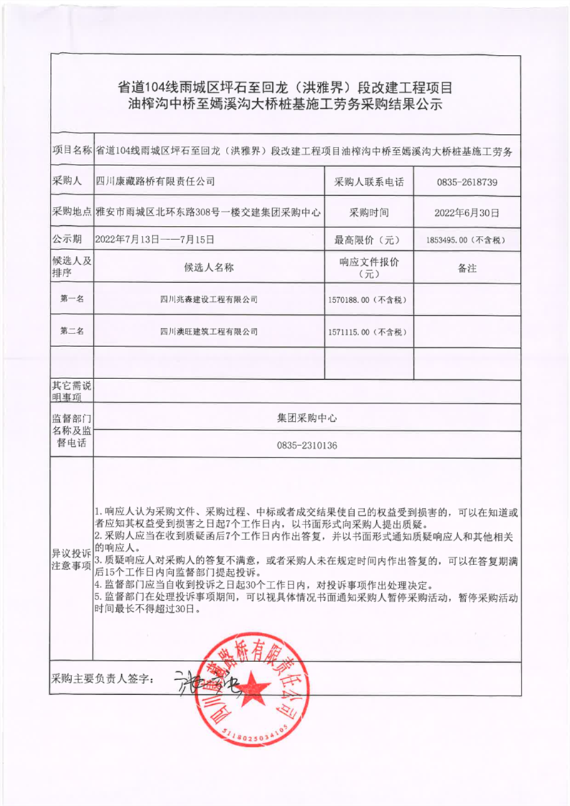 四川康藏路橋有限責(zé)任公司省道104線(xiàn)雨城區(qū)坪石至回龍(洪雅界)段改建工程項(xiàng)目油榨溝中橋至嫣溪溝大橋樁基施工勞務(wù)采購(gòu)結(jié)果公示