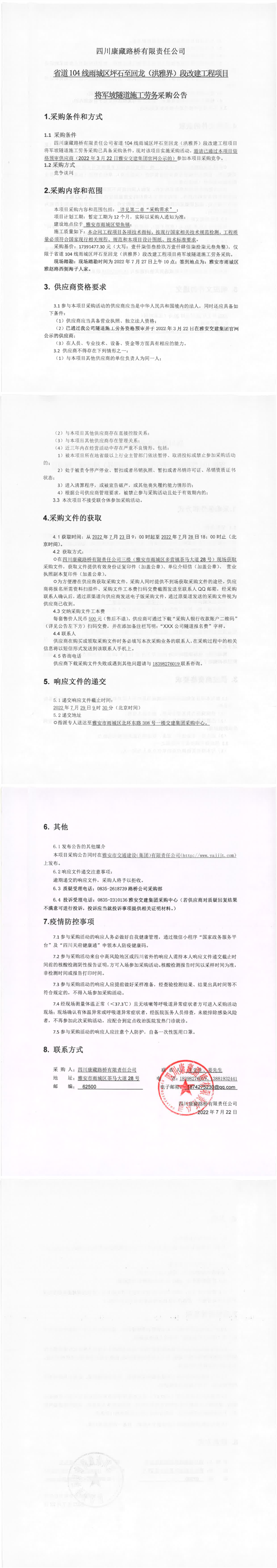 四川康藏路橋有限責(zé)任公司省道104線雨城區(qū)坪石至回龍(洪雅界)段改建工程項目將軍坡隧道施工勞務(wù)采購公告