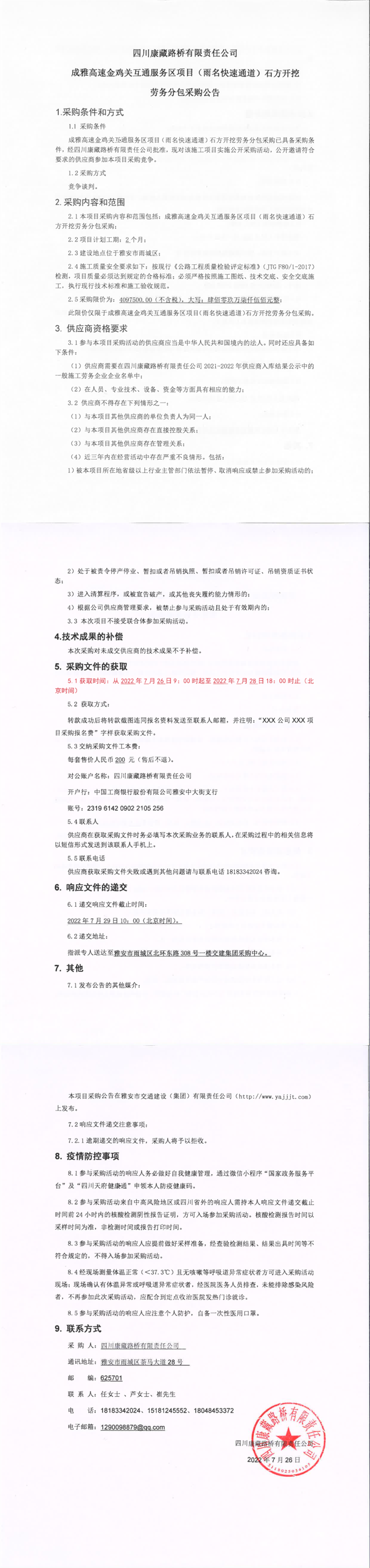四川康藏路橋有限責(zé)任公司成雅高速金雞關(guān)互通及服務(wù)區(qū)項(xiàng)目(雨名快速通道)石方開挖勞務(wù)分包采購公告