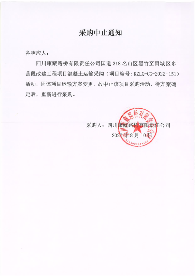 四川康藏路橋有限責任公司國道318名山區(qū)黑竹至雨城區(qū)多營段改建工程項目混凝土運輸采購中止通知