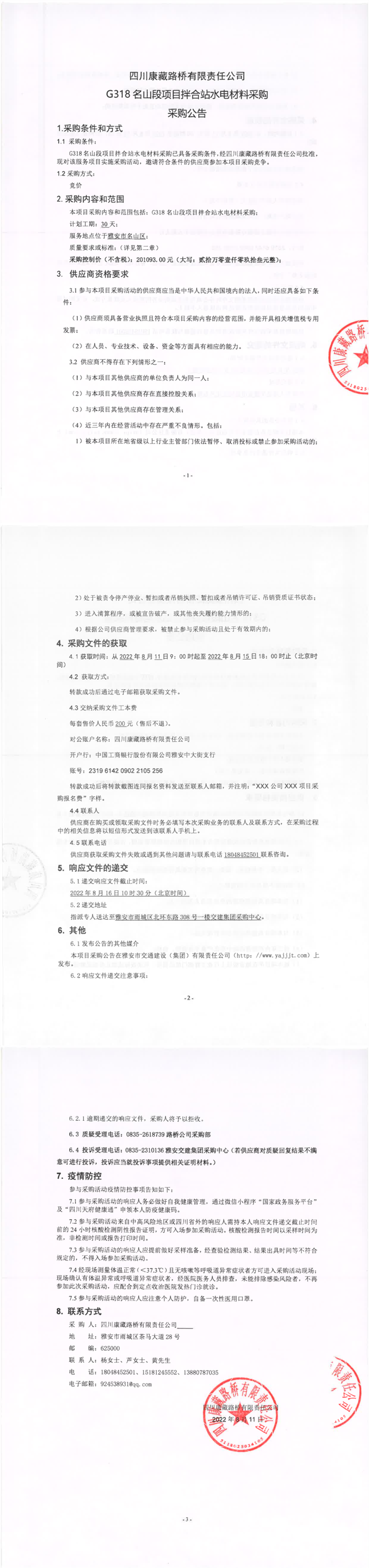 四川康藏路橋有限責(zé)任公司G318名山段項(xiàng)目拌合站水電材料采購(gòu)采購(gòu)公告