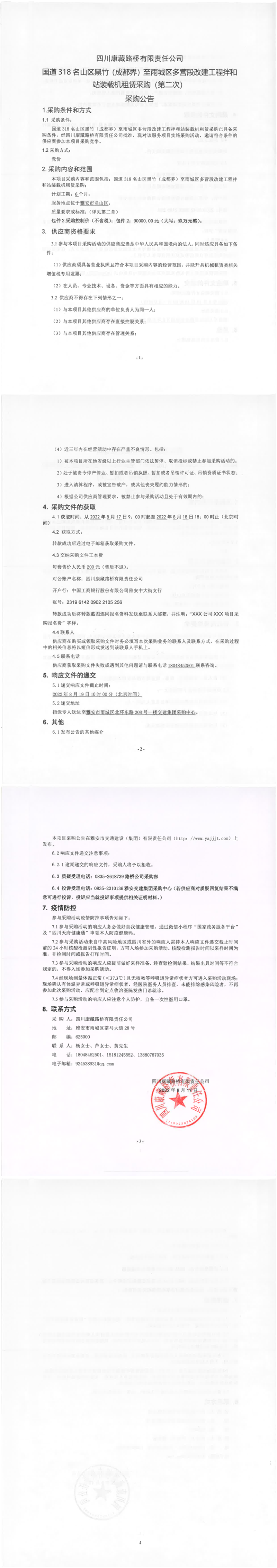 四川康藏路橋有限責(zé)任公司國道318名山區(qū)黑竹(成都界)至雨城區(qū)多營段改建工程拌和站裝載機(jī)租賃采購(第二次)采購公告