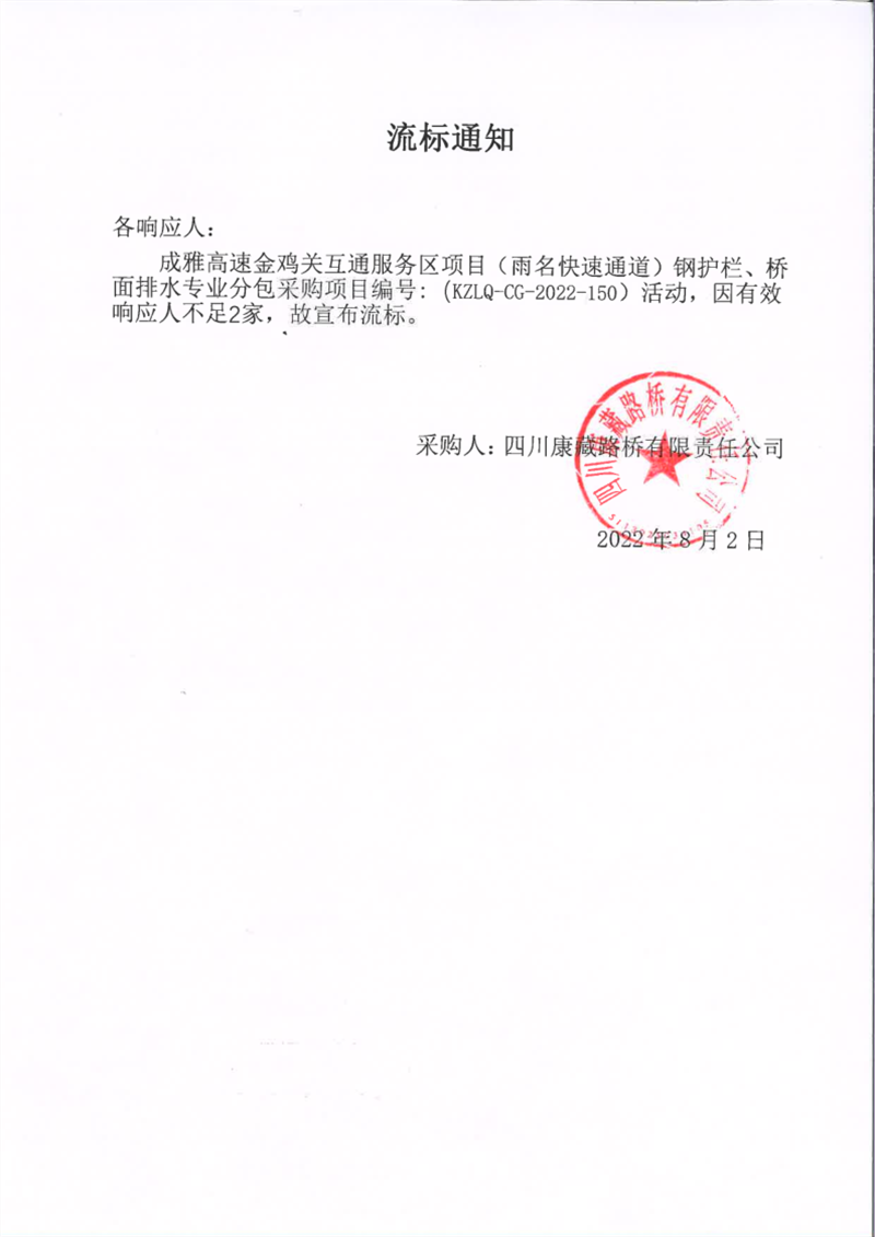 四川康藏路橋有限責任公司成雅高速金雞關(guān)互通服務(wù)區(qū)項目(雨名快速通道)鋼護欄、橋面排水專業(yè)分包采購項目流標通知