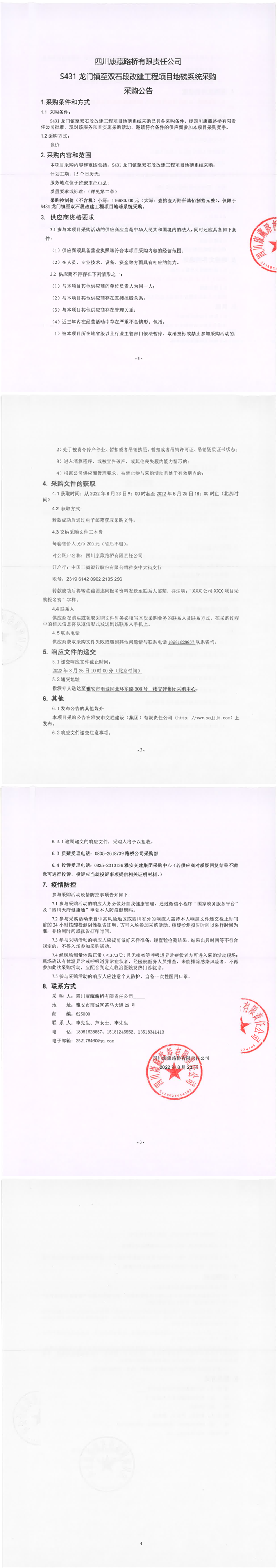 四川康藏路橋有限責任公司S431龍門鎮(zhèn)至雙石段改建工程項目地磅系統(tǒng)采購采購公告