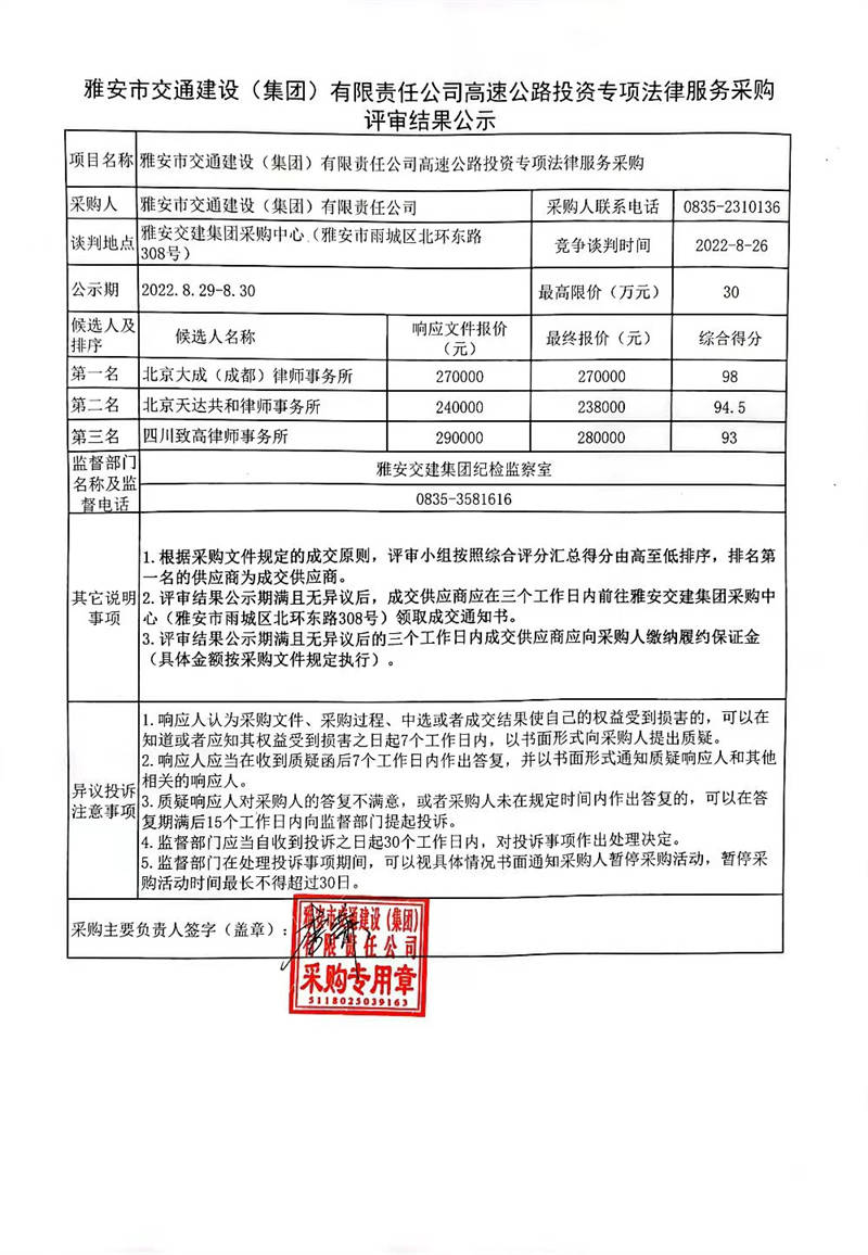 雅安市交通建設(shè)(集團(tuán))有限責(zé)任公司高速公路投資專(zhuān)項(xiàng)法律服務(wù)采購(gòu)評(píng)審結(jié)果公示