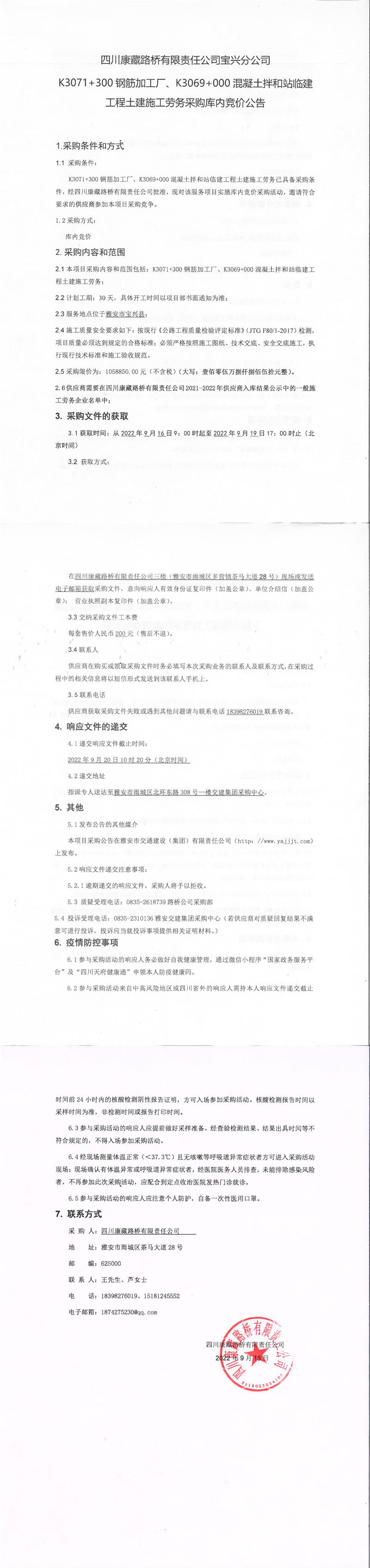 四川康藏路橋有限責任公司寶興分公司K3071+300鋼筋加工廠、K3069+000混凝土拌和站臨建工程土建施工勞務采購庫內競價公告