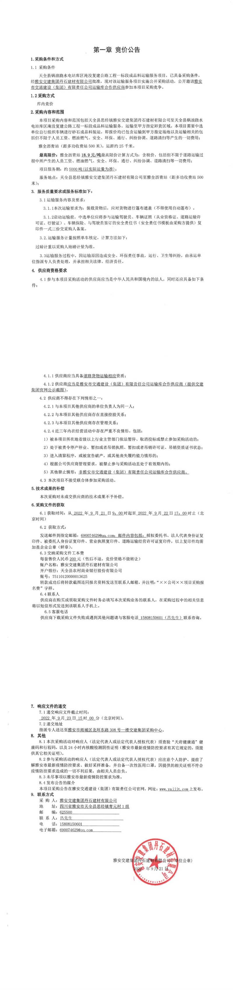 雅安交建集團(tuán)丹石建材有限公司天全縣鍋浪蹺水電站庫區(qū)淹沒復(fù)建公路工程一標(biāo)段成品料運(yùn)輸服務(wù)項(xiàng)目競價(jià)公告