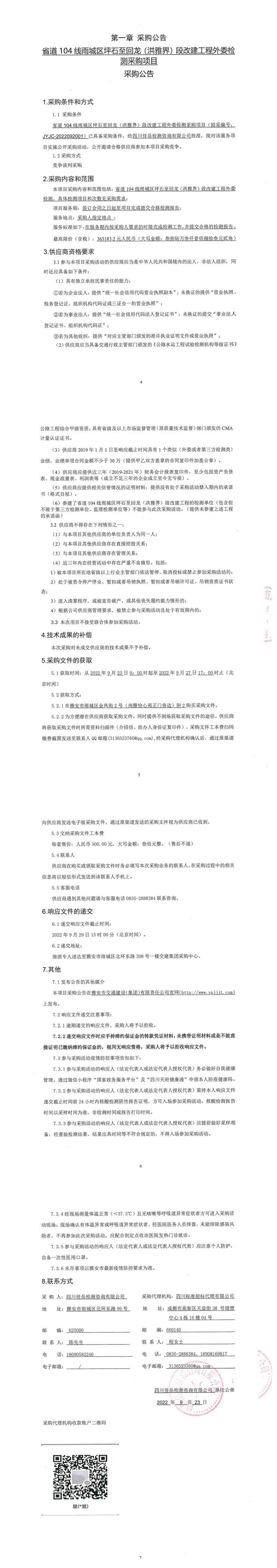 四川佳岳檢測咨詢有限公司省道104線雨城區(qū)坪石至回龍(洪雅界)段改建工程外委檢測采購項(xiàng)目采購公告