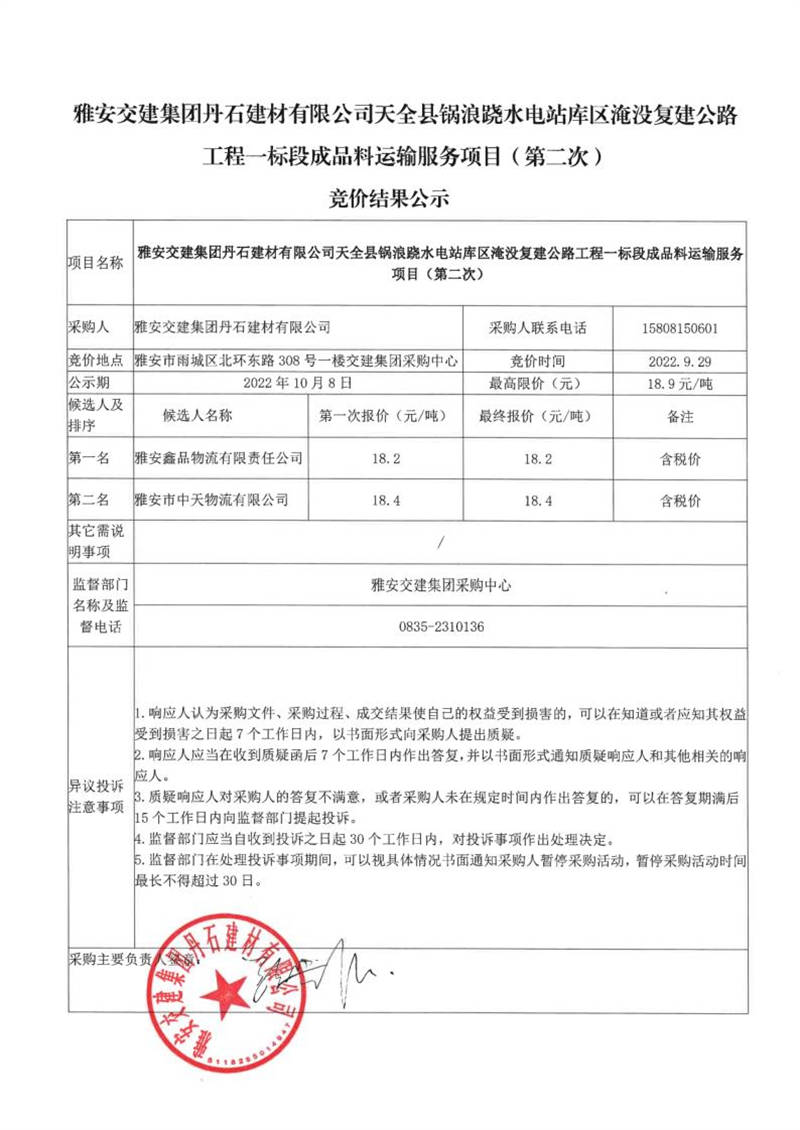 雅安交建集團丹石建材有限公司天全縣鍋浪蹺水電站庫區(qū)淹沒復(fù)建公路工程一標(biāo)段成品料運輸服務(wù)項目(第二次)競價結(jié)果公示
