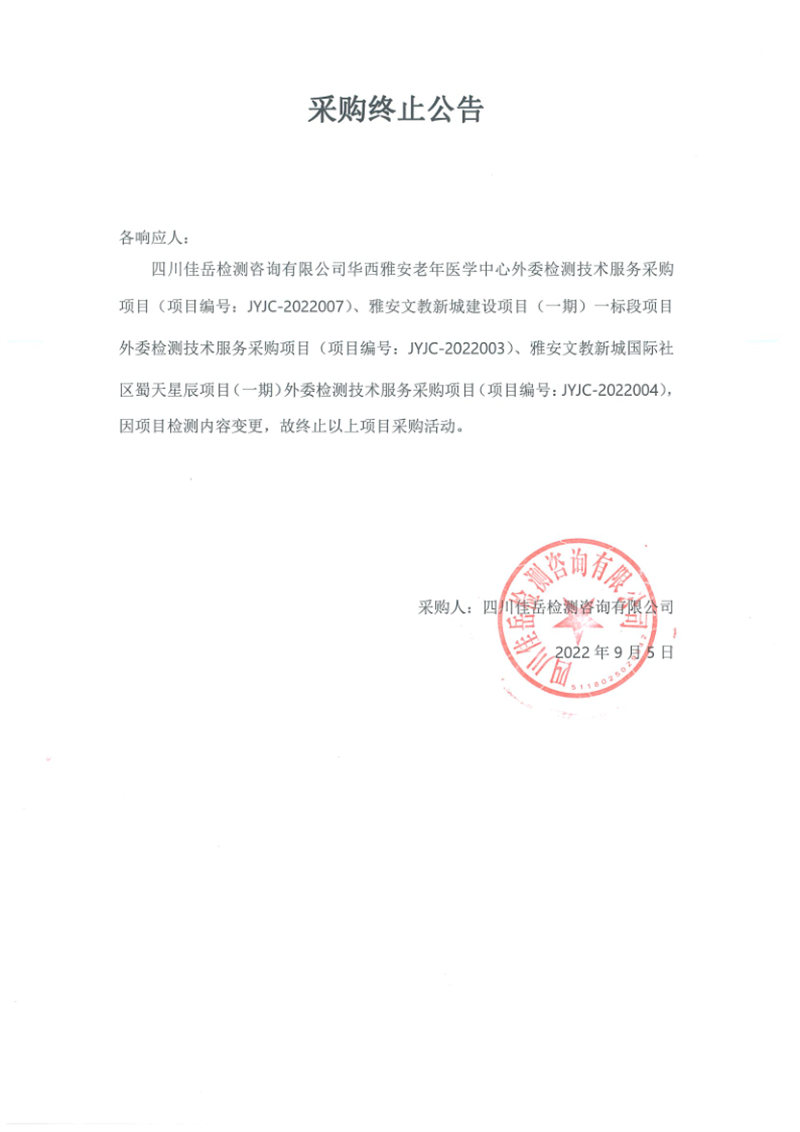 四川佳岳檢測咨詢有限公司采購項目(項目編號:JYJC-2022007、JYJC-2022003、JYJC-2022004)采購中止公告
