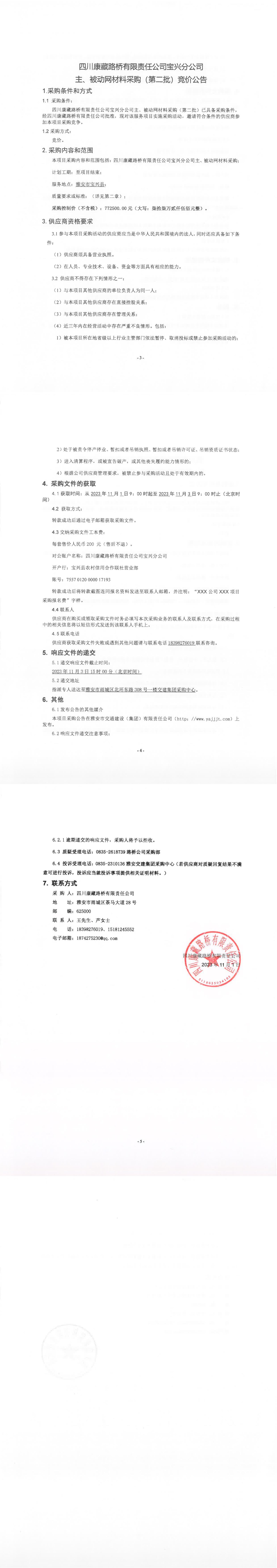 四川康藏路橋有限責(zé)任公司寶興分公司主、被動(dòng)網(wǎng)材料采購(gòu)(第二批)競(jìng)價(jià)公告