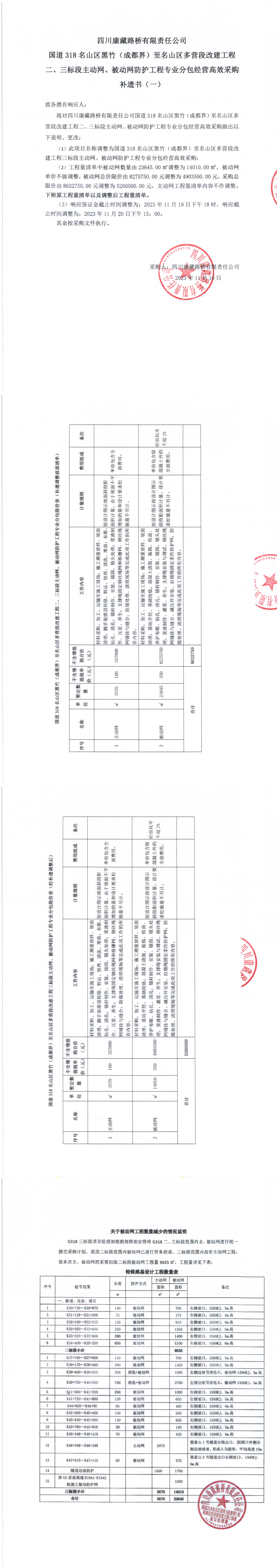 四川康藏路橋有限責(zé)任公司國(guó)道318名山區(qū)黑竹(成都界)至名山區(qū)多營(yíng)段改建工程二、三標(biāo)段主動(dòng)網(wǎng)、被動(dòng)網(wǎng)防護(hù)工程專業(yè)分包經(jīng)營(yíng)高效采購(gòu)補(bǔ)遺書(shū)(一)
