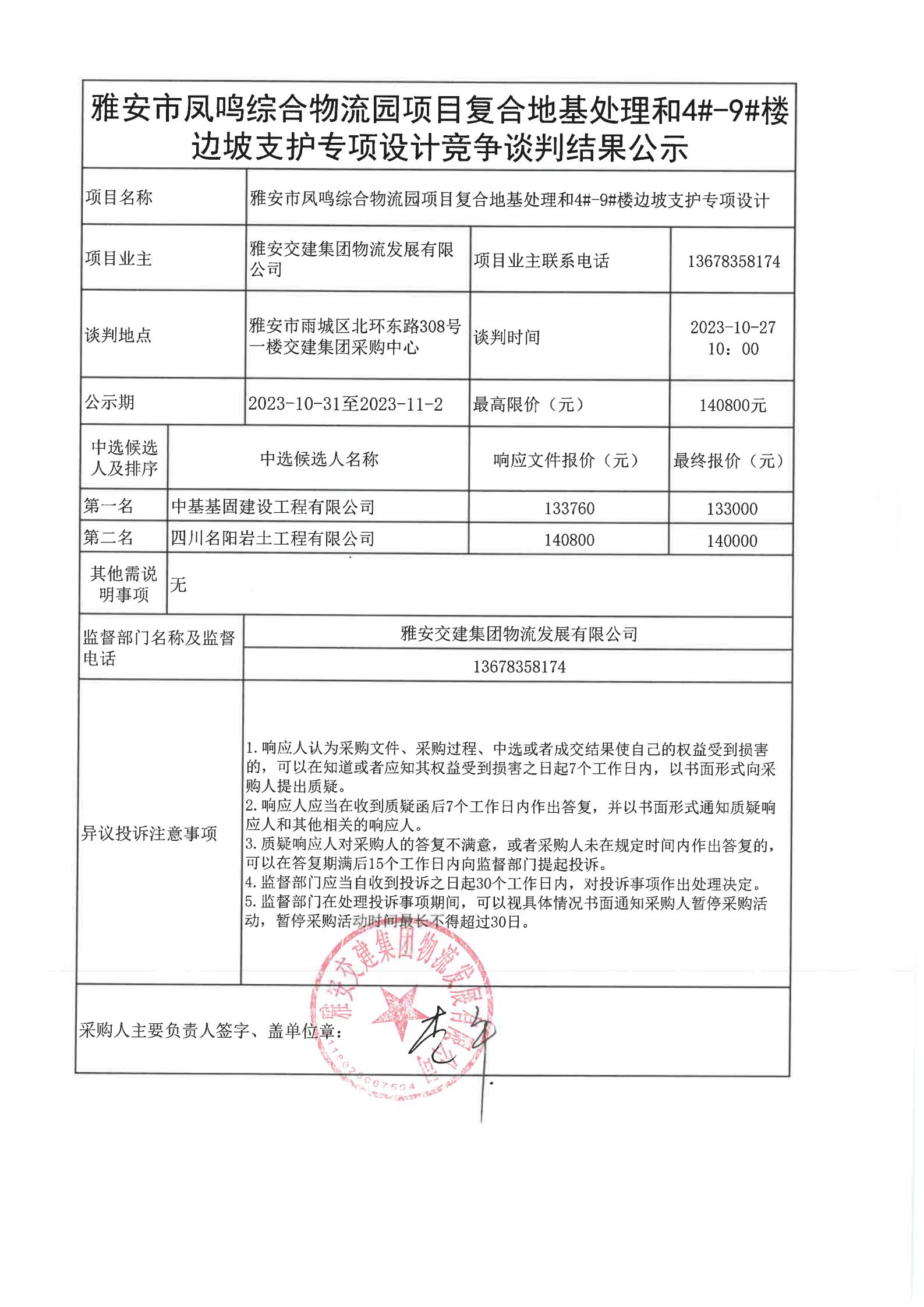雅安交建集團(tuán)物流發(fā)展有限公司雅安市鳳鳴綜合物流園項(xiàng)目復(fù)合地基處理和4#-9#樓邊坡支護(hù)專(zhuān)項(xiàng)設(shè)計(jì)競(jìng)爭(zhēng)談判結(jié)果公示