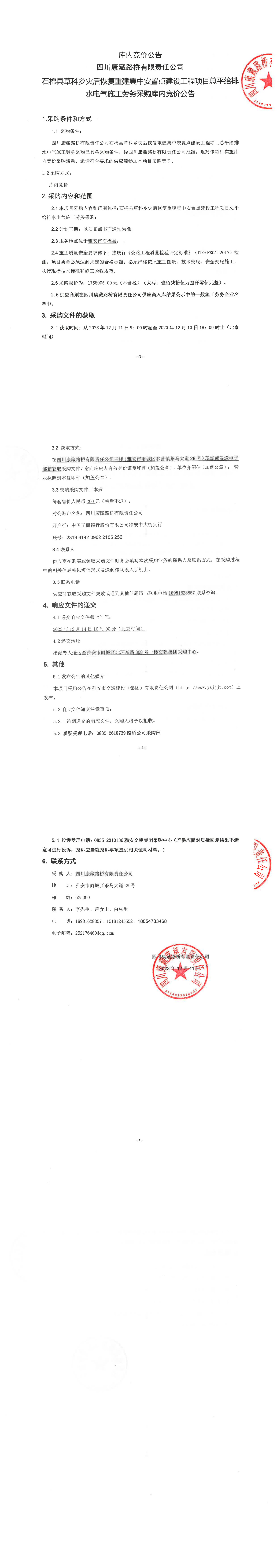 四川康藏路橋有限責(zé)任公司石棉縣草科鄉(xiāng)災(zāi)后恢復(fù)重建集中安置點(diǎn)建設(shè)工程項(xiàng)目總平給排水電氣施工勞務(wù)采購(gòu)庫(kù)內(nèi)競(jìng)價(jià)公告