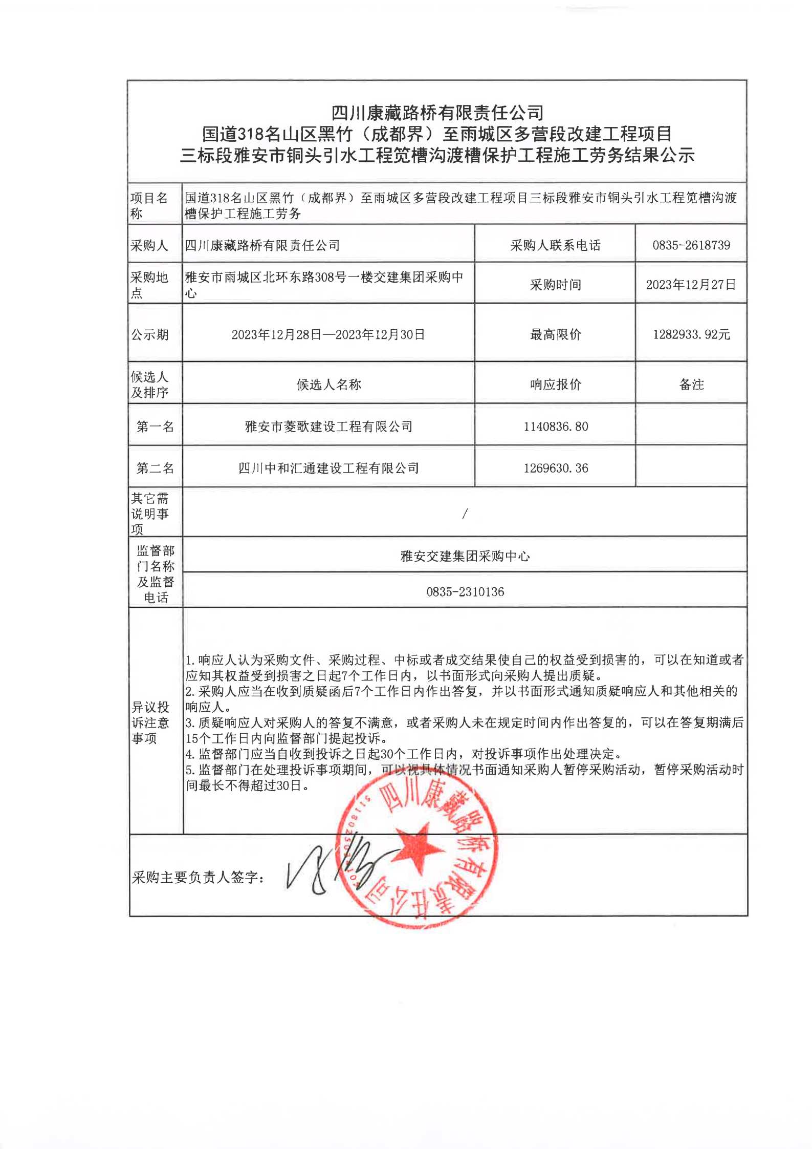 四川康藏路橋有限責任公司國道318名山區(qū)黑竹(成都界)至雨城區(qū)多營段改建工程項目三標段雅安市銅頭引水工程筧槽溝渡槽保護工程施工勞務結果公示