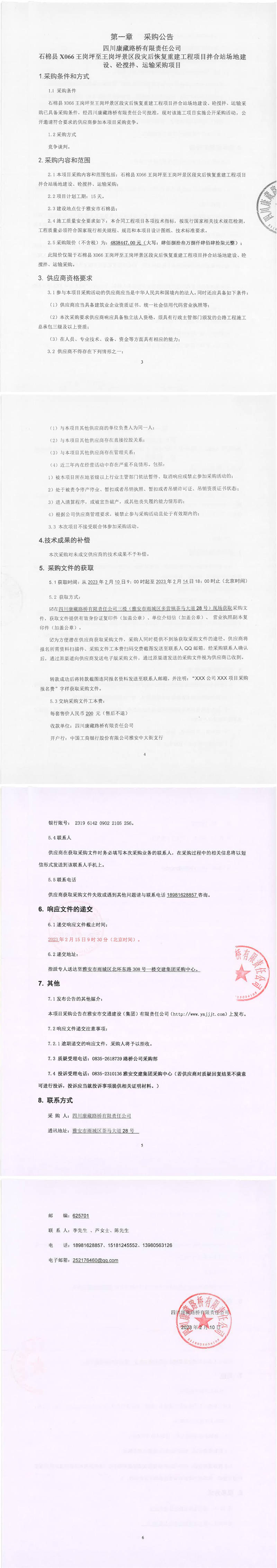 四川康藏路橋有限責(zé)任公司石棉縣X066王崗坪至王崗坪景區(qū)段災(zāi)后恢復(fù)重建工程項(xiàng)目拌合站場(chǎng)地建設(shè)、砼攪拌、運(yùn)輸采購項(xiàng)目采購公告