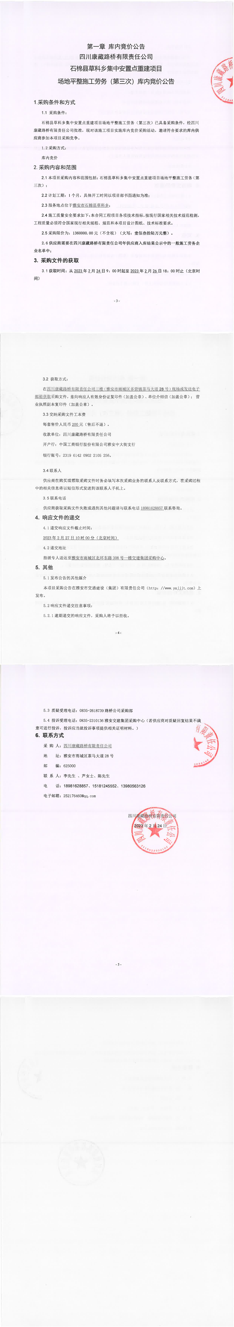 四川康藏路橋有限責任公司石棉縣草科鄉(xiāng)集中安置點重建項目場地平整施工勞務(wù)(第三次)庫內(nèi)競價