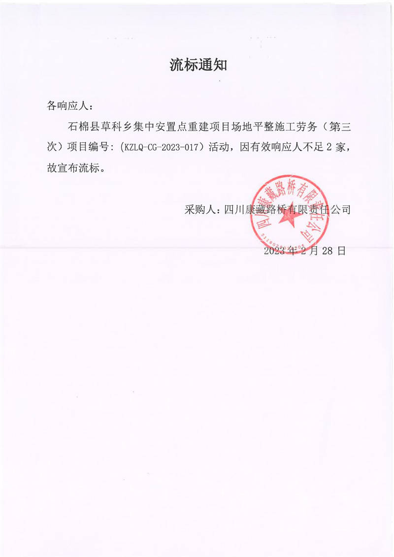 四川康藏路橋有限責(zé)任公司石棉草科鄉(xiāng)集中安置點重建項目場地平整施工勞務(wù)(第三次)庫內(nèi)競價流標(biāo)通知