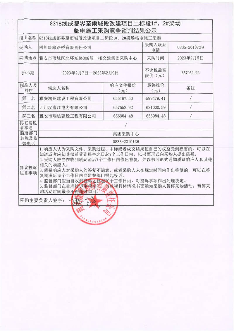 四川康藏路橋有限責(zé)任公司G318線(xiàn)成都界至雨城段改建項(xiàng)目二標(biāo)段1#、2#梁場(chǎng)臨電施工采購(gòu)競(jìng)爭(zhēng)談判結(jié)果公示