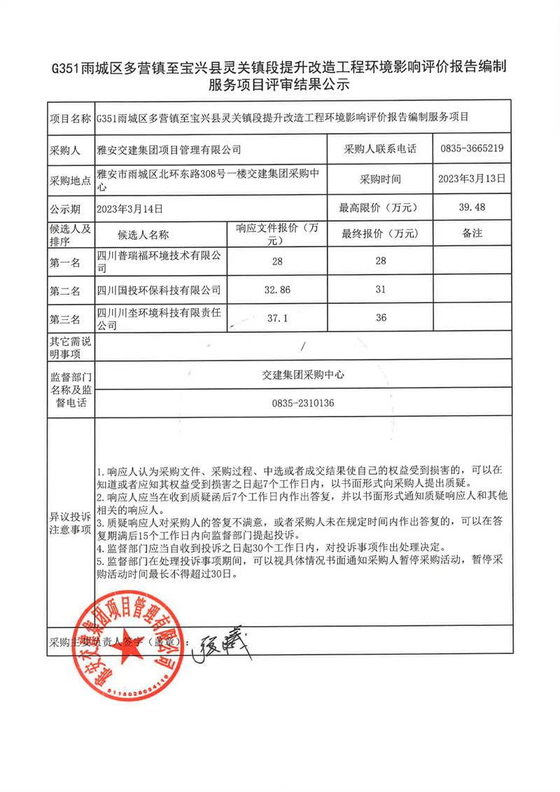 雅安交建集團(tuán)項(xiàng)目管理有限公司G351雨城區(qū)多營鎮(zhèn)至寶興縣靈關(guān)鎮(zhèn)段提升改造工程環(huán)境影響評(píng)價(jià)報(bào)告編制服務(wù)項(xiàng)目結(jié)果公示
