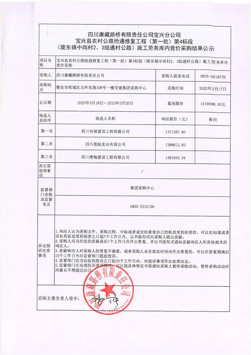 四川康藏路橋有限責任公司寶興分公司寶興縣農(nóng)村公路搶通修復工程(第一批)第4標段(隴東鎮(zhèn)中崗村2、3組通村公路)施工勞務庫內(nèi)競價采購結(jié)果公示