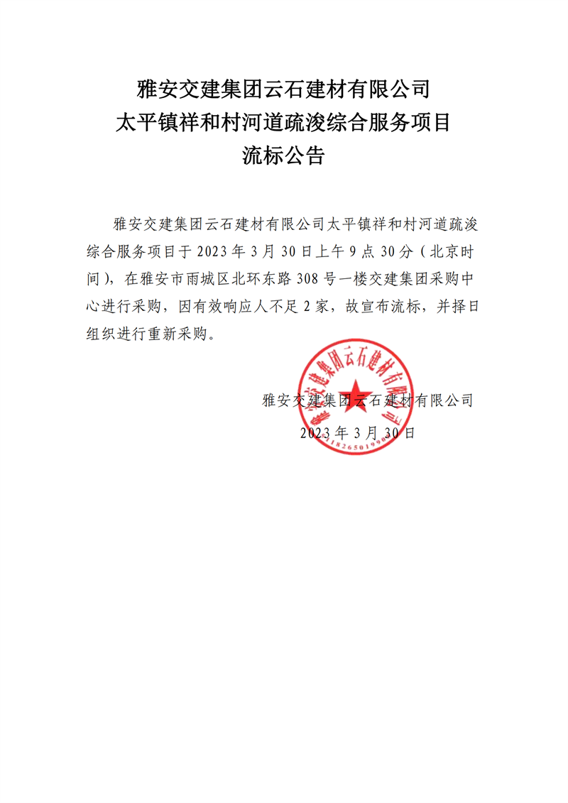 雅安交建集團(tuán)云石建材有限公司太平鎮(zhèn)祥和村河道疏浚綜合服務(wù)項(xiàng)目流標(biāo)通知