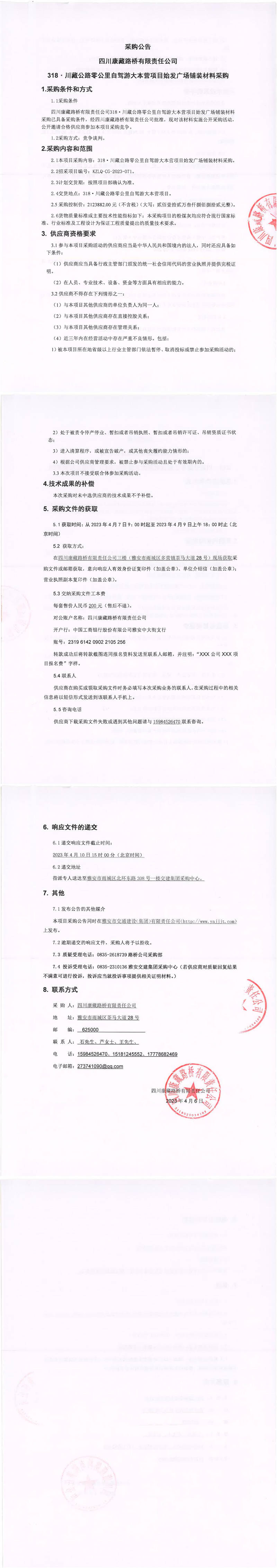 四川康藏路橋有限責(zé)任公司318·川藏公路零公里自駕游大本營(yíng)項(xiàng)目始發(fā)廣場(chǎng)鋪裝材料采購公告