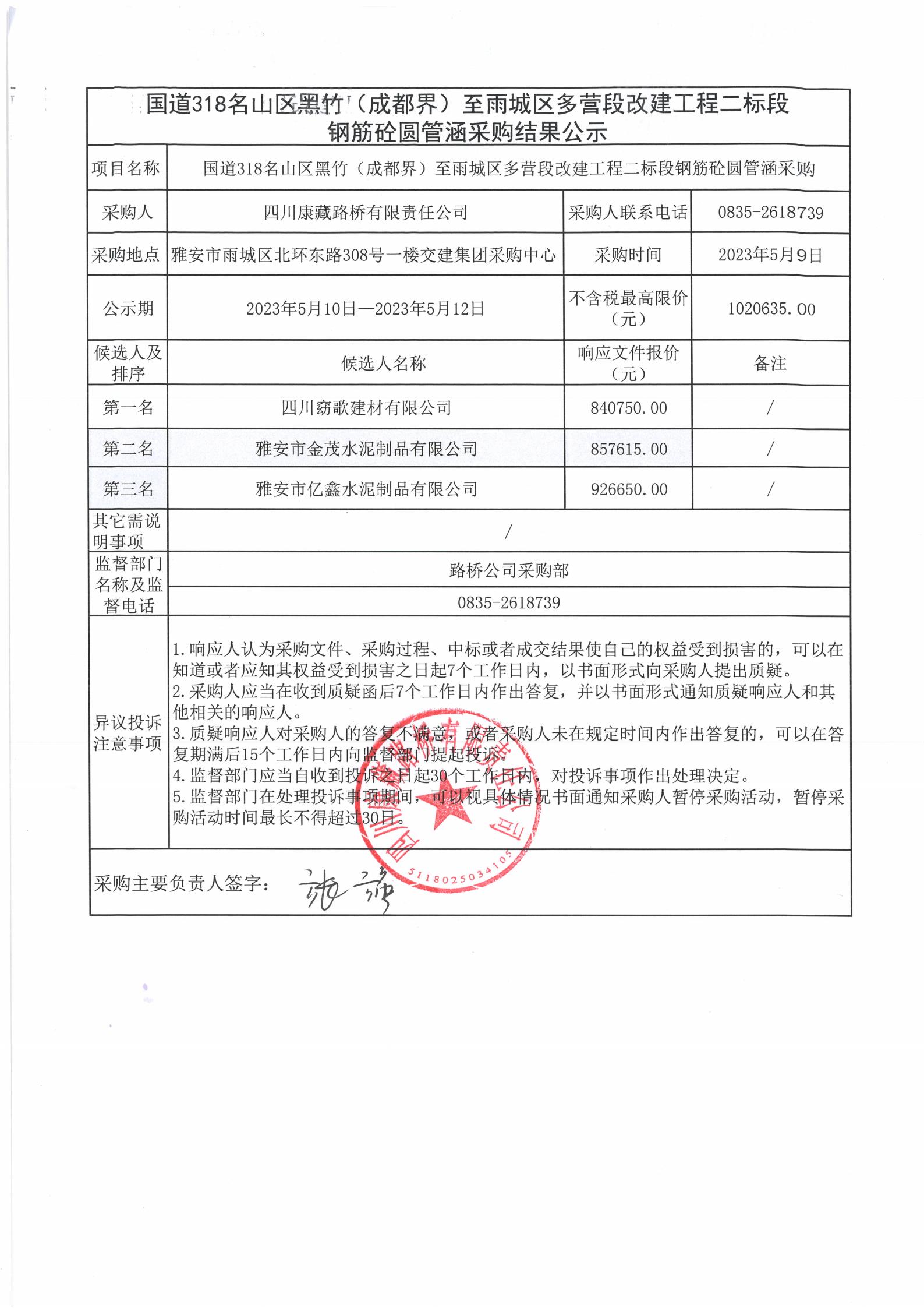 四川康藏路橋有限責(zé)任公司國道318名山區(qū)黑竹(成都界)至雨城區(qū)多營段改建工程二標段鋼筋砼圓管涵采購結(jié)果公示
