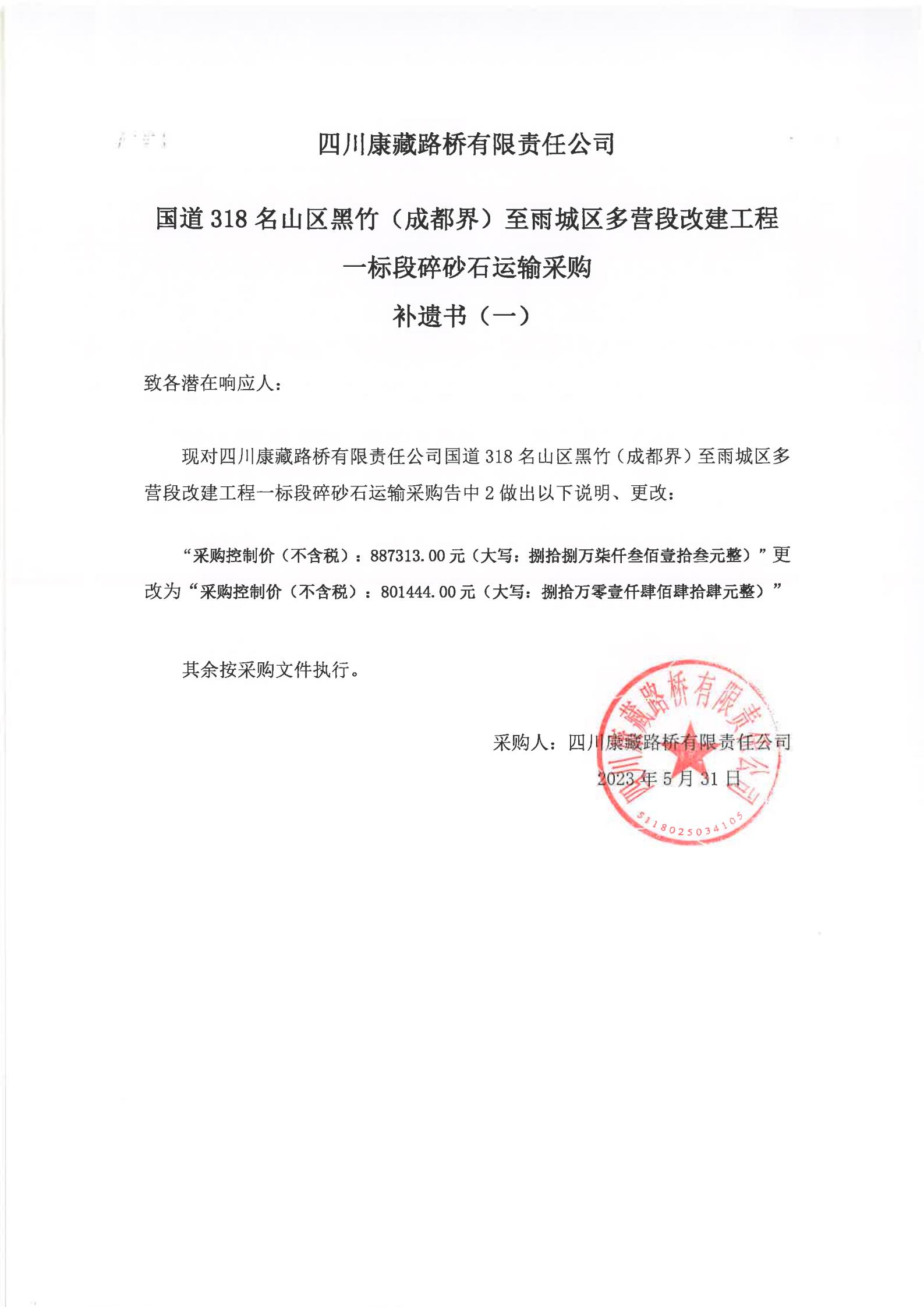 四川康藏路橋有限責(zé)任公司國(guó)道318名山區(qū)黑竹(成都界)至雨城區(qū)多營(yíng)段改建工程一標(biāo)段碎砂石運(yùn)輸采購補(bǔ)遺書(一)